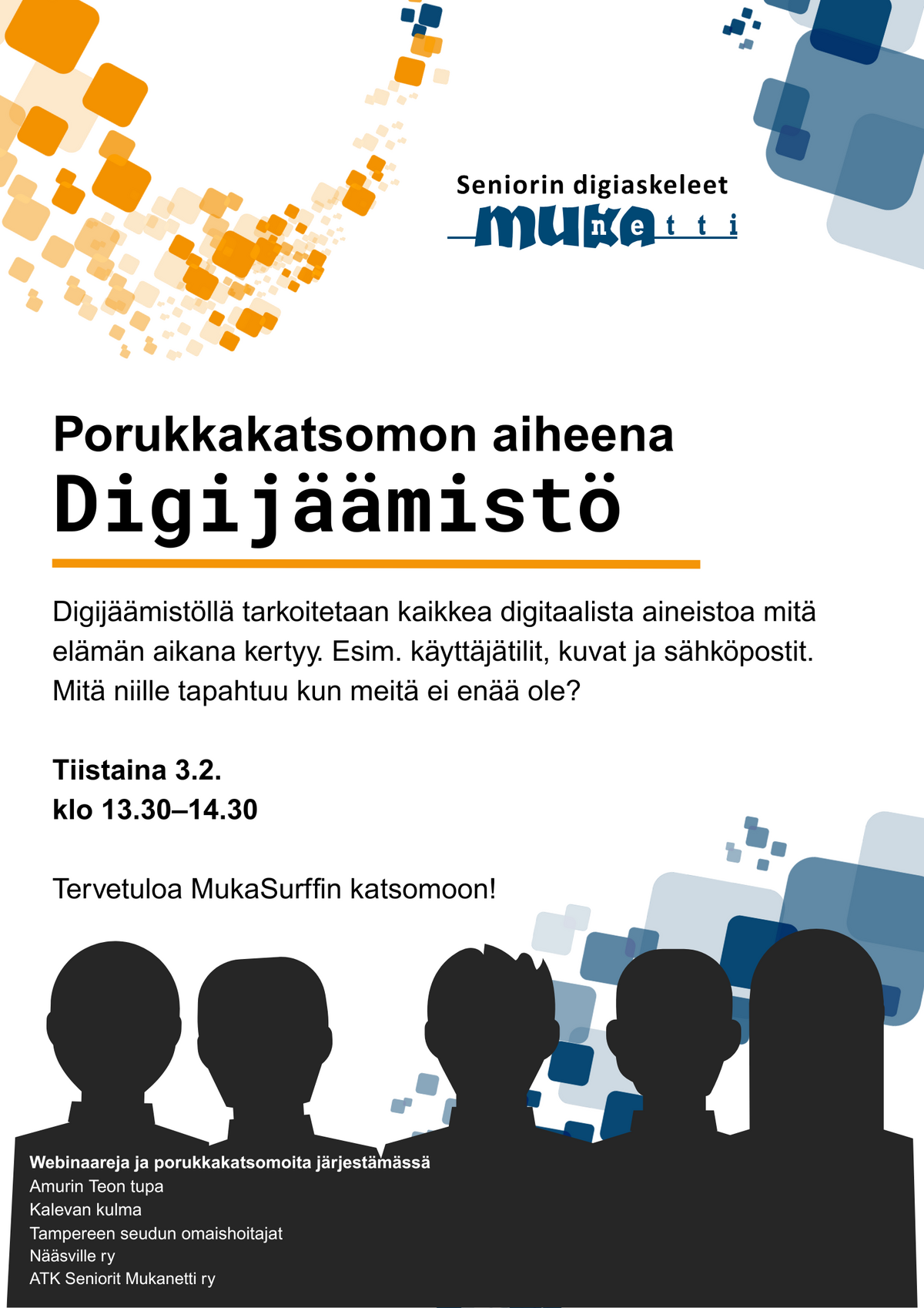 Digijäämistöllä tarkoitetaan kaikkea digitaalista aineistoa mitä elämän aikana kertyy. Esimerkiksi käyttäjätilit, kuvat ja sähköpostit. Mitä niille tapahtuu kun meitä ei enää ole? Miten voimme huolehtia niistä?