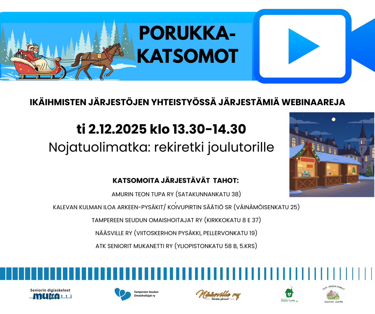 Joulukuun porukkakatsomossa pääset seuraamaan nojatuolimatkaa joulutorille! Sinun tarvitsee vain saapua paikalle ja me avaamme Teams-yhteyden katsomolle. Yhdessä voidaan ihmetellä, mihin joulutorille matka johtaakaan...